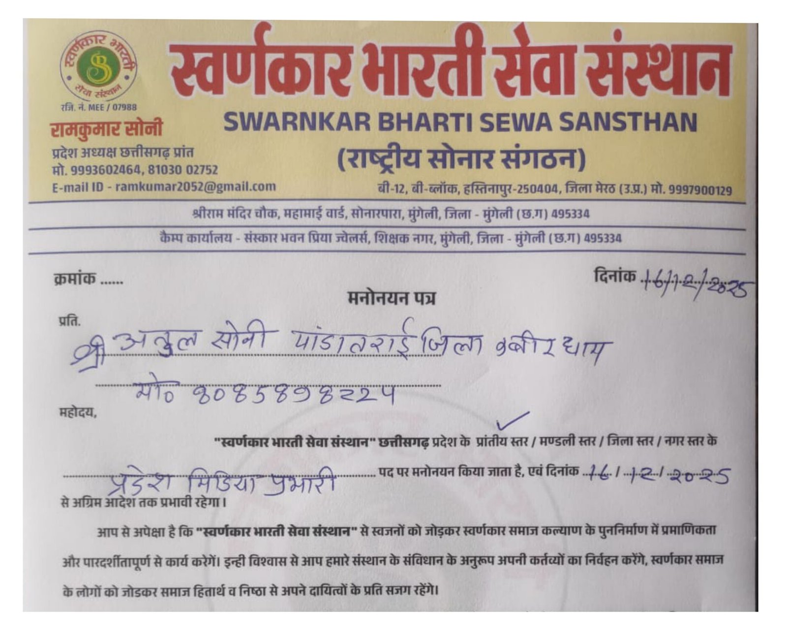 *рд╕реНрд╡рд░реНрдгрдХрд╛рд░ рд╕рдорд╛рдЬ рдХреА рд╕реЗрд╡рд╛, рдПрдХрддрд╛ рдФрд░ рдЙрддреНрдерд╛рди рдХреЗ рд▓рд┐рдП рдХрд╛рд░реНрдп рдХрд░рдиреЗ рд╡рд╛рд▓реЗ рд╕реНрд╡рд░реНрдгрдХрд╛рд░ рднрд╛рд░рддреА рд╕реЗрд╡рд╛ рд╕рдВрд╕реНрдерд╛рди, рдЫрддреНрддреАрд╕рдЧрдврд╝ рдХреЗ рдкреНрд░рдзрд╛рди рдПрд╡рдВ рдирд╡рдирд┐рдпреБрдХреНрдд рдкрджрд╛рдзрд┐рдХрд╛рд░рд┐рдпреЛрдВ рдХреЛ рд╣рд╛рд░реНрджрд┐рдХ рдмрдзрд╛рдИ рдПрд╡рдВ рд╢реБрднрдХрд╛рдордирд╛рдПрдБред