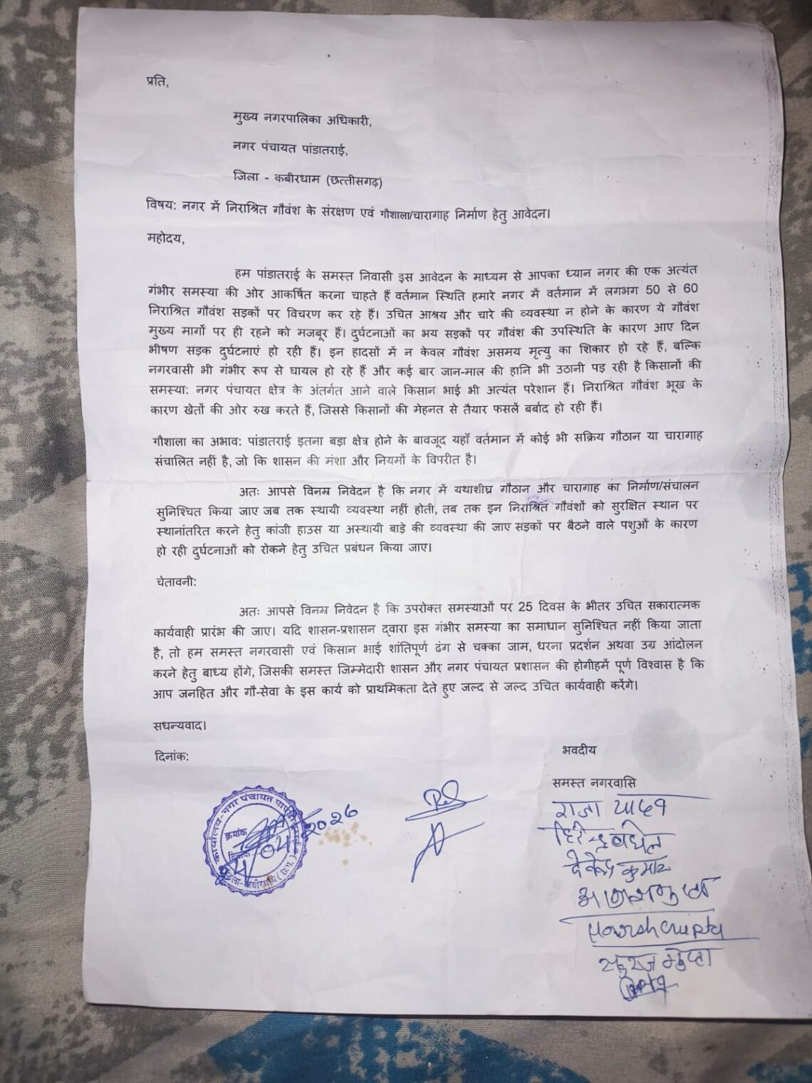 (कवर्धा )। पांडातराई नगर पंचायत क्षेत्र में निराश्रित गौवंश के कारण उत्पन्न हो रही गंभीर समस्याओं, निरंतर बढ़ती सड़क दुर्घटनाओं और किसानों की फसलों के नुकसान को लेकर स्थानीय युवाओं एवं किसान भाइयों ने शुक्रवार को नगर पंचायत कार्यालय पहुंचकर मुख्य नगर पालिका अधिकारी (CMO) के नाम एक ज्ञापन सौंपा। प्रशासन से गौवंश के संरक्षण एवं सुरक्षा हेतु तत्काल प्रभाव से गौशाला एवं चारागाह निर्माण कराने का विनम्र अनुरोध किया गया है।