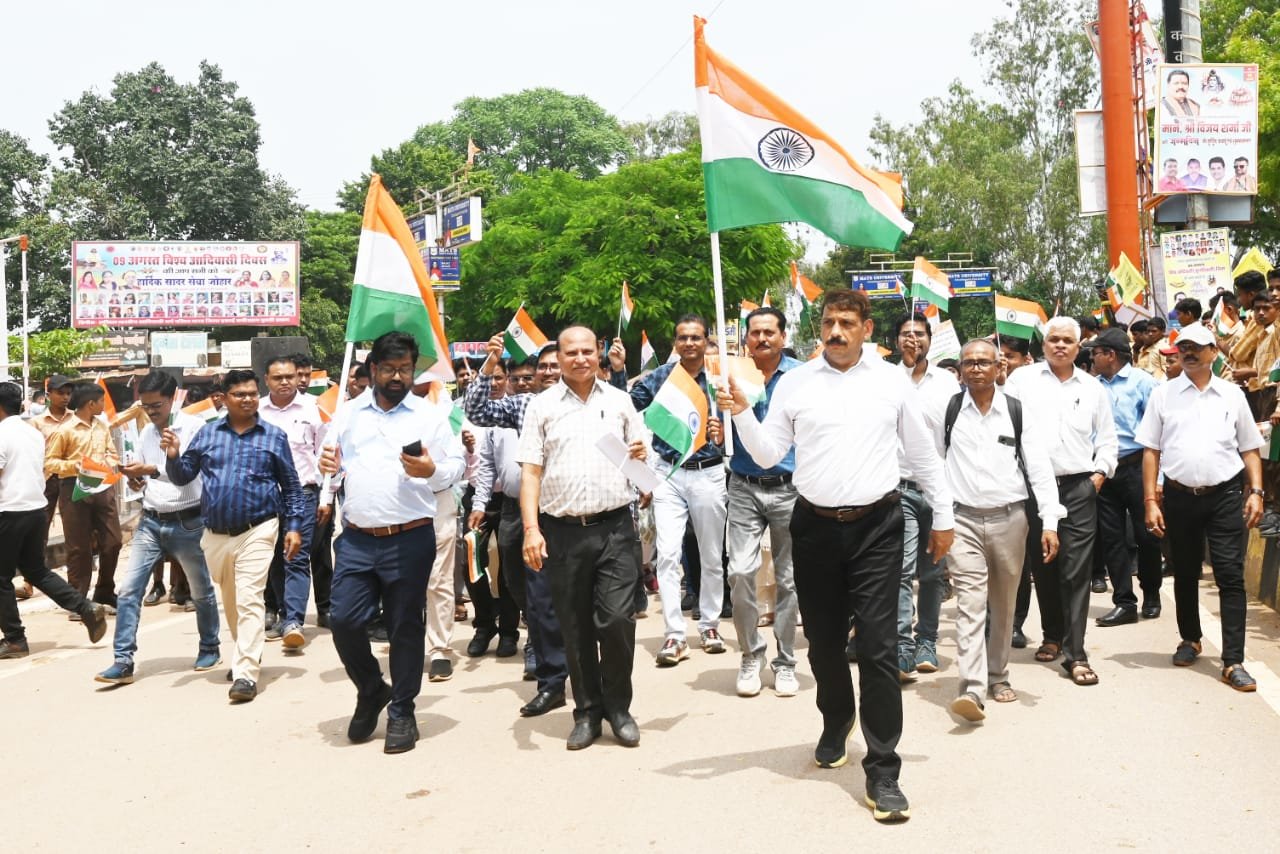 कवर्धा, 12 अगस्त 2025। हर घर तिरंगा अभियान के अंतर्गत आज स्वामी करपात्री जी स्कूल से तिरंगा यात्रा निकाली गई। कलेक्टर गोपाल वर्मा स्वयं राष्ट्रीय ध्वज लेकर तिरंगा यात्रा में सम्मिलित हुए और शहर में राष्ट्रप्रेम एवं देशभक्ति का संदेश प्रदान किया। सैकड़ों की संख्या में छात्र-छात्राएं, शिक्षक, अधिकारी-कर्मचारी और आम नागरिक देशभक्ति के नारों के साथ यात्रा में शामिल हुए। तिरंगा यात्रा कवर्धा शहर के स्वामी करपात्री स्कूल से प्रारंभ होकर शहर के प्रमुख चौक-चौराहों से गुजरते हुए भारत माता चौक तक पहुंचा, कलेक्टर श्री गोपाल वर्मा ने सभी विद्यार्थियों को राष्ट्र की एकता, अखंडता और सम्मान बनाए रखने की शपथ दिलाई। तिरंगा यात्रा के दौरान शहर देशभक्ति के गीतों, वंदे मातरम् और भारत माता की जय के नारों से गूंज उठा। हर ओर तिरंगे के रंग लहरा रहे थे और छोटे-बड़े सभी के चेहरे पर राष्ट्र के प्रति गर्व और उत्साह साफ झलक रहा था। बच्चे हाथों में तिरंगा झंडा थामे गर्व से यात्रा में कदमताल करते दिखे। आज की यह तिरंगा यात्रा राष्ट्र के प्रति प्रेम, एकता और समर्पण का जीवंत उदाहरण बनी, जिसने कवर्धा के हर नागरिक के दिल में देशभक्ति के प्रति प्रेरित किया। इस अवसर पर जिला पंचायत सीईओं श्री अजय कुमार त्रिपाठी, जिला शिक्षा अधिकारी श्री वर्मा, सहायक संचालक श्री एमके गुप्ता सहित विद्यार्थी, अधिकारी-कर्मचारी, शहर के नागरिकगण उपस्थित थे।