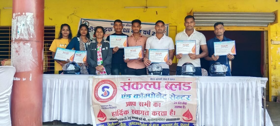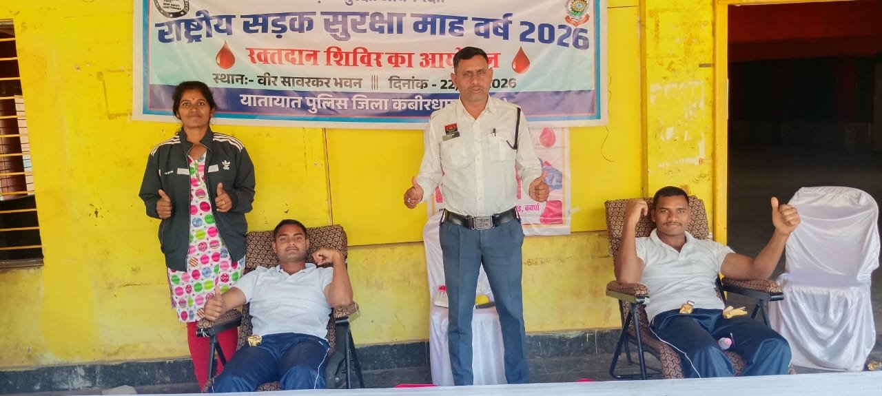 कवर्धा सड़क सुरक्षा माह 2026 के तहत आमजन में यातायात नियमों के प्रति जागरूकता बढ़ाने एवं सामाजिक उत्तरदायित्व के निर्वहन के उद्देश्य से कबीरधाम पुलिस द्वारा निरंतर विविध जागरूकता कार्यक्रम आयोजित किए जा रहे हैं। पुलिस अधीक्षक धर्मेन्द्र सिंह (आईपीएस) के निर्देशानुसार, अतिरिक्त पुलिस अधीक्षक पुष्पेन्द्र बघेल एवं अमित पटेल के मार्गदर्शन में आज वीर सावरकर भवन, कवर्धा में रक्तदान शिविर का आयोजन किया गया। शिविर में पुलिस अधिकारी-कर्मचारियों सहित आम नागरिकों ने उत्साहपूर्वक सहभागिता की। रक्तदान शिविर में कुल 15 रक्तदाताओं द्वारा स्वेच्छा से रक्तदान किया गया। रक्तदान करने वाले सभी रक्तदाताओं को हेलमेट और प्रशस्ति पत्र प्रदान कर सम्मानित किया गया। कार्यक्रम में पुलिस विभाग के अधिकारी-कर्मचारी, यातायात पुलिस का स्टाफ, स्वास्थ्य विभाग का अमला एवं बड़ी संख्या में नागरिक उपस्थित रहे।